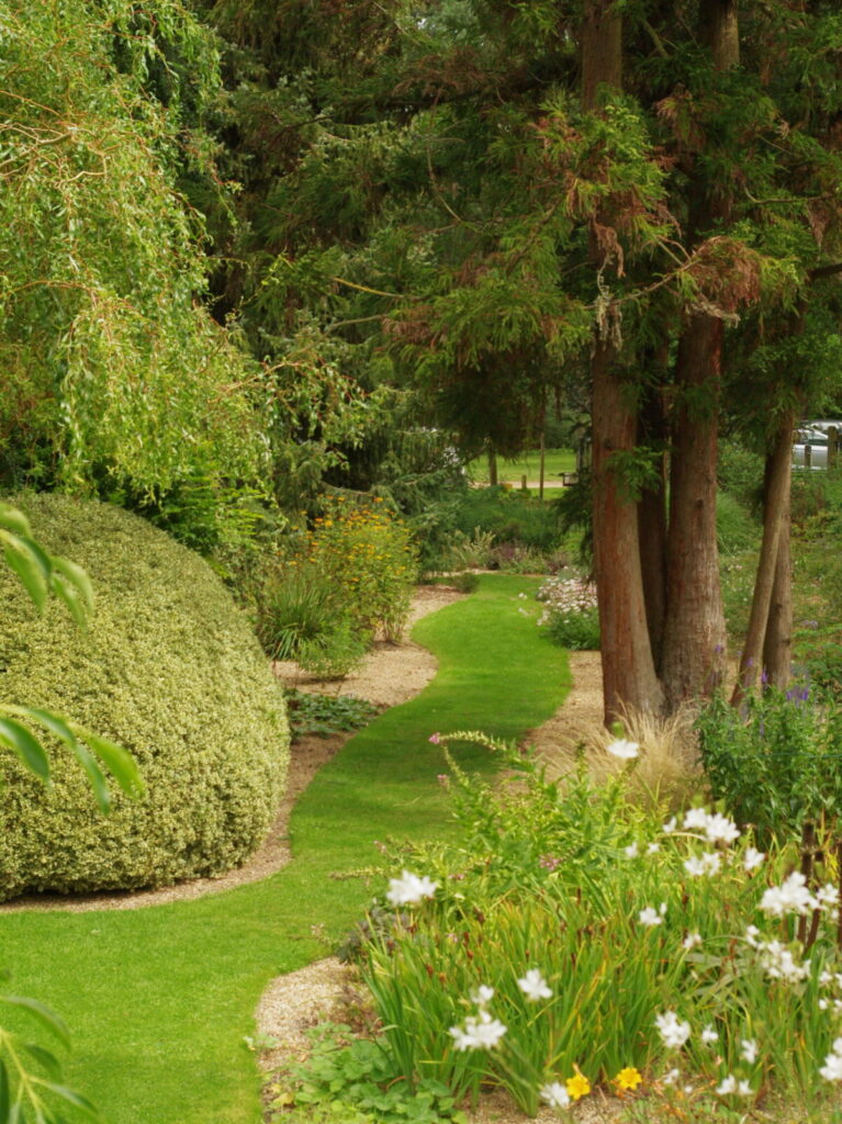Aed on täis käänulisi teeradasid ja iga käänaku tagant tekib uus vaade. Põnevaks teevad aias käimise suureks kasvanud puuvõrad, mis loovad lahedaid varjulisi soppe ja raamivad vaateid oma pikkade okstega. Sügisel annavad aias värvi ameerika ambrapuu (Liquidambar styraciflua), lepalehine pihlakas (Sorbus alnifolia), harilik parukapuu (Cotinus coggygria) ja kanada juudapuu ‘Forest Pansy’ (Cercis canadensis). Teid mööda madalamatele aladele liikudes muutub haljastus järjest lopsakamaks. Kõik teed viivad lõpuks jõe või tiigi kaldale.